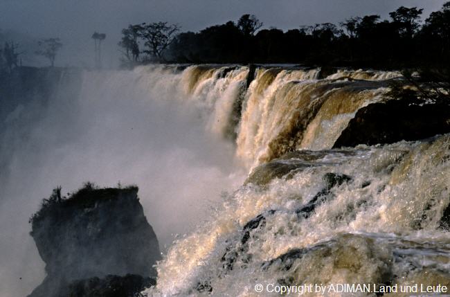 Der Name Iguazú hat seinen Ursprung aus den guaranischen Wörtern y für Wasser und guasu für groß. Als erster Europäer entdeckte der spanische Conquistador Álvar Núñez Cabeza de Vaca die Fälle; einer auf der argentinischen Seite ist nach ihm benannt. In der Nähe liegen die Städte Foz do Iguaçu im brasilianischen Bundesstaat Paraná und Puerto Iguazú in der argentinischen Provinz Misiones und der Stausee Itaipú. (Wikipedia)