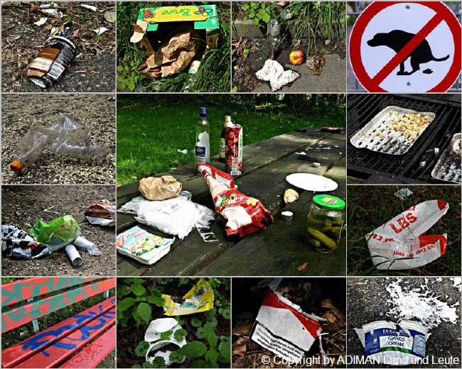 Der Punkt ist aber nicht das Thema Hundekot. Damit wird man bei Spaziergängen kaum berührt. Wohl aber mit dem anderen Abfall, den menschlichen Wertstoffen, die überall herumliegen, auf Wegen und insbesondere in der Nähe von Bänken, durch Flaschen, z.T. Scherben, Dosen, Imbiss-Verpackungen, Plastik- und Papiertüten, gebrauchte Taschentücher, auch menschliche Notdurft mit Tachentüchern markiert, usw. Dinge, die tage- und wochenlang in der Gegend liegen und nicht nur das Wohlbefinden beeinträchtigen sondern auch für Besucher kein einladendes Bild abgeben.
